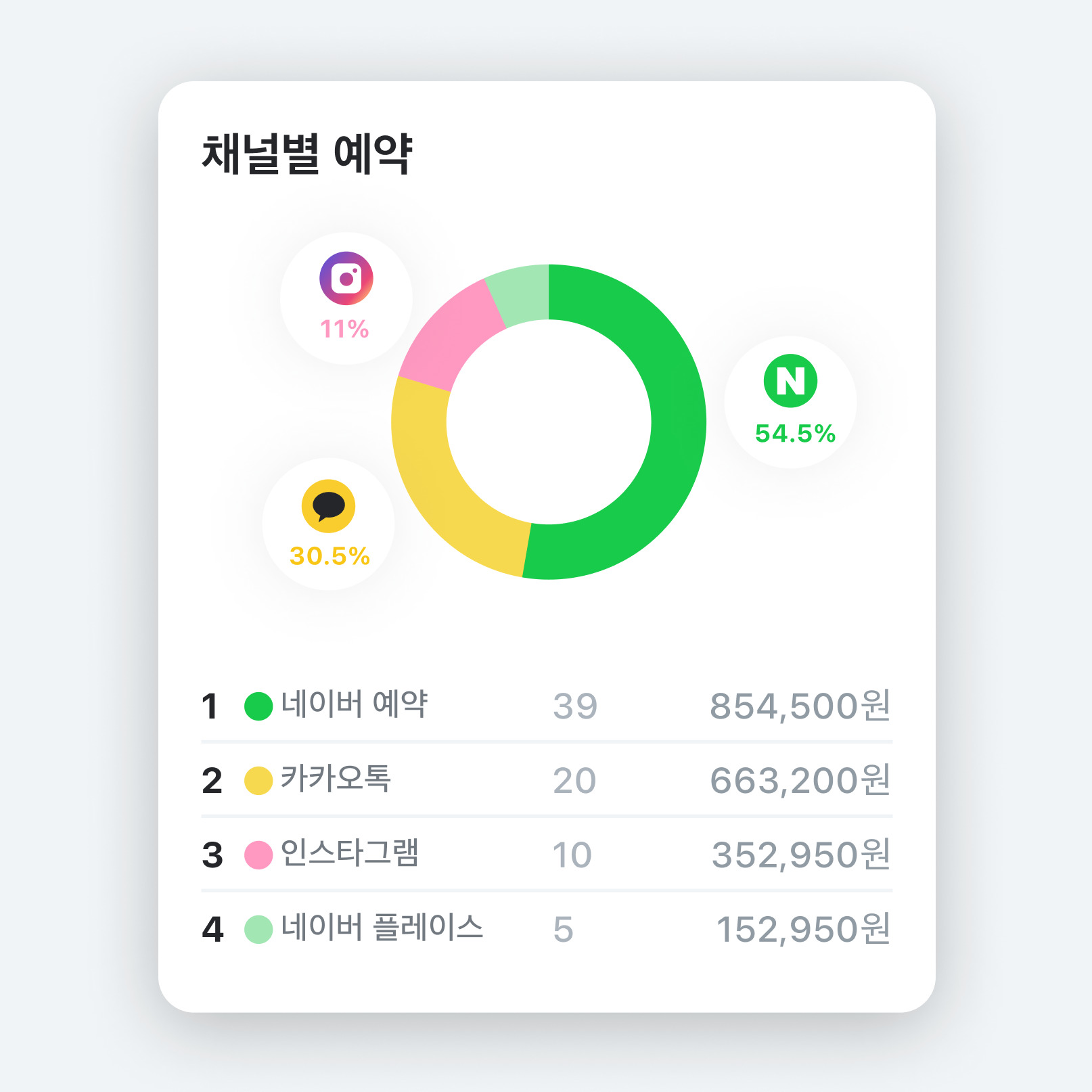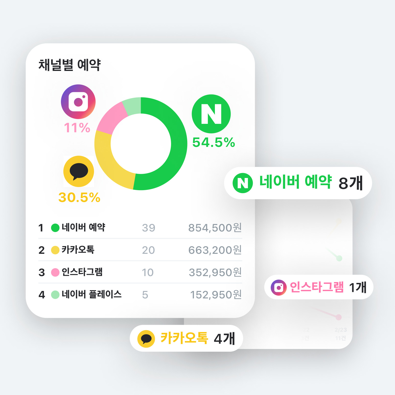 콜라보살롱에 예약 채널을 연동하면 네이버, 인스타, 카톡 중 어느 채널을 통해 고객님들이 예약을 했는지와 각 채널별 예약 건수와 매출까지 통계로 보여줘요.