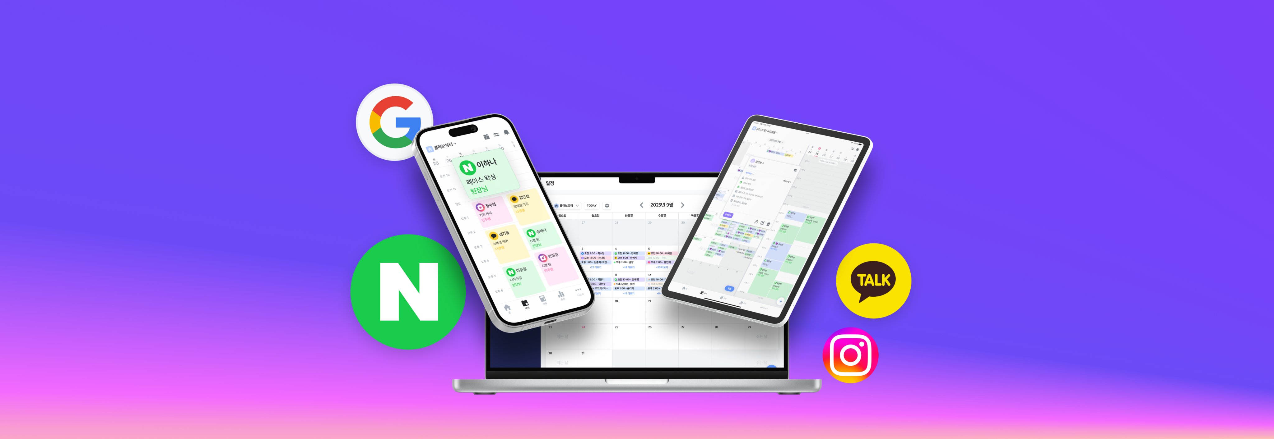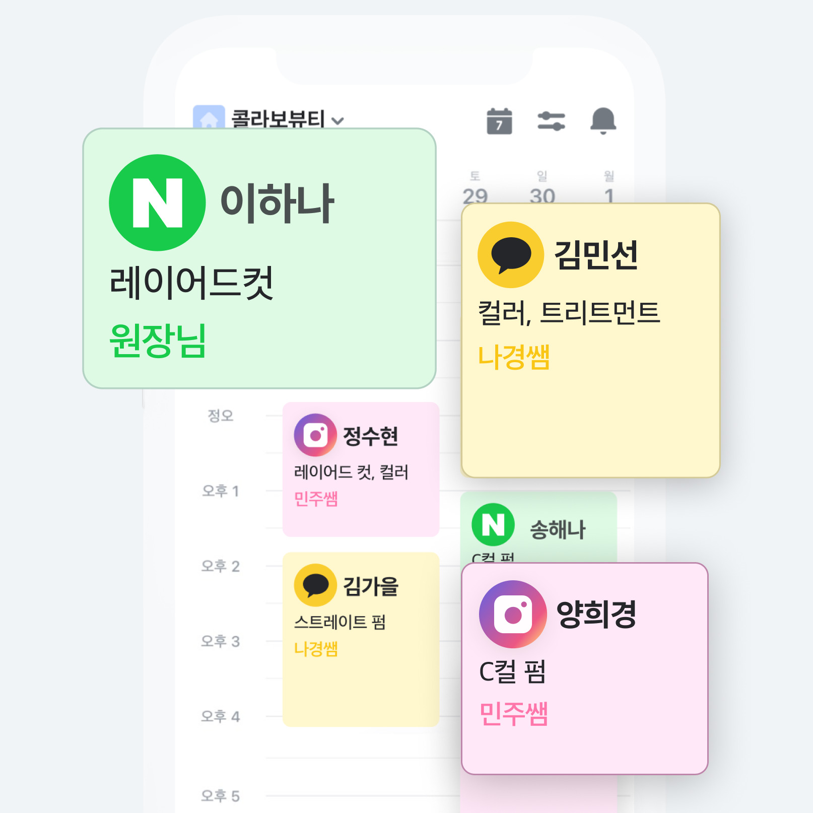 이제 콜라보살롱이 네이버, 인스타, 카톡에서 들어오는 모든 예약을 자동으로 업데이트하고, 한 눈에 확인할 수 있도록 정리도 해드려요!