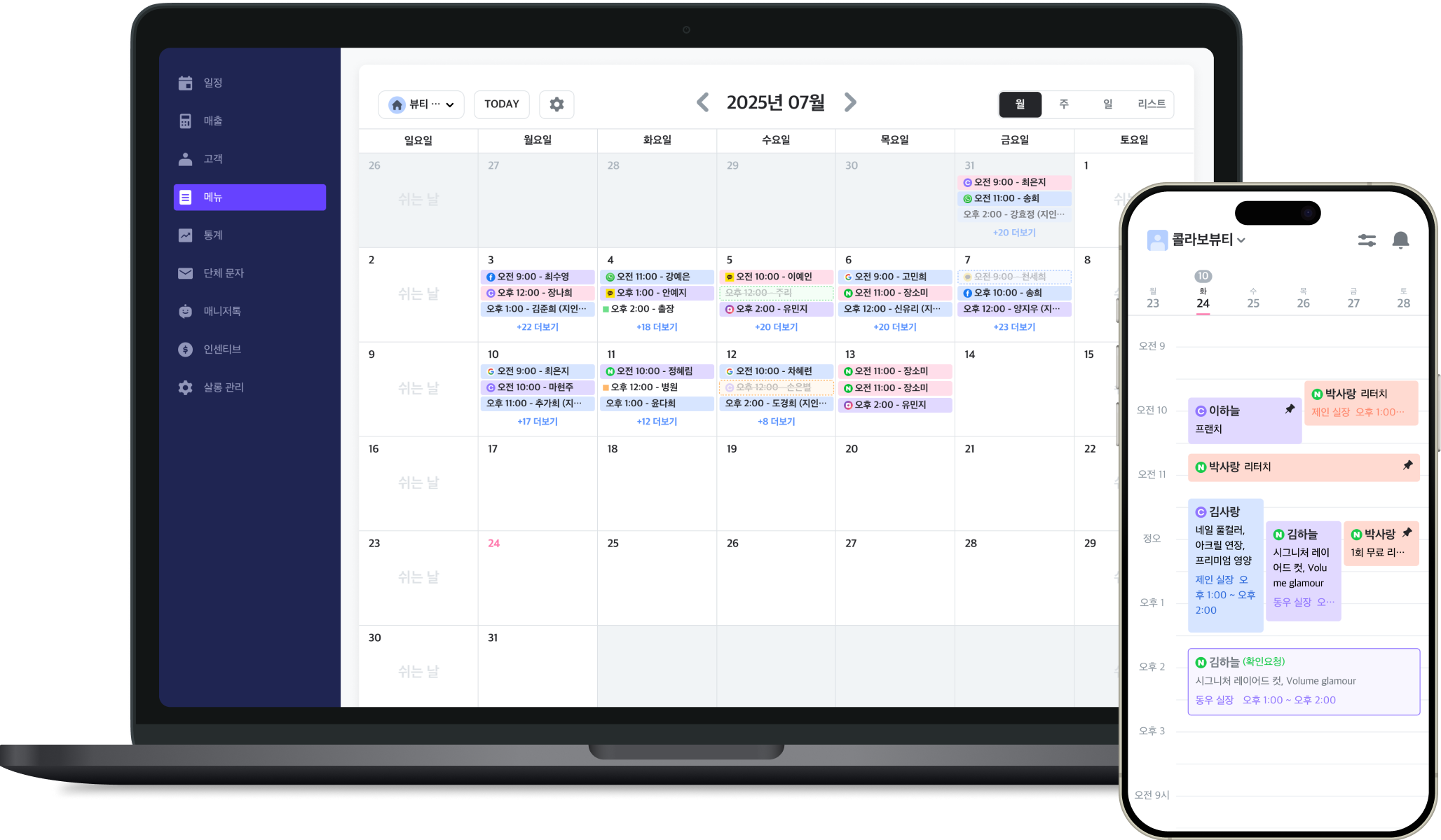 멤버별로 예약 현황과 매출을 깔끔하게 정리해 주고, 중요한 정보는 원장님만 볼 수 있도록 똑똑하게 권한을 나눌 수 있어요.